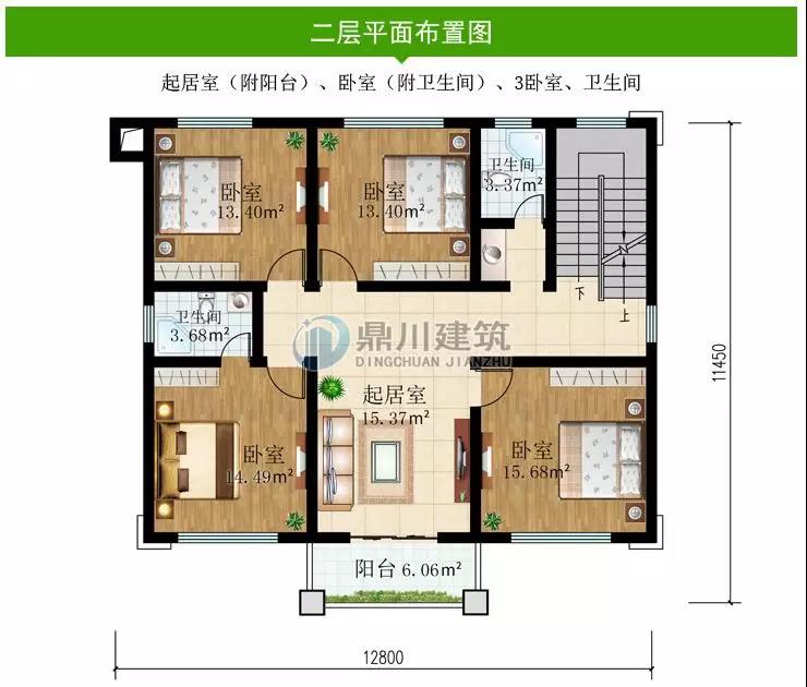 二 層:起居室(附陽臺(tái))、臥室(附衛(wèi)生間)、3臥室、衛(wèi)生間