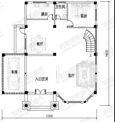 一 層:入口玄關(guān)、客廳、餐廳、廚房、客房、衛(wèi)生間、車庫