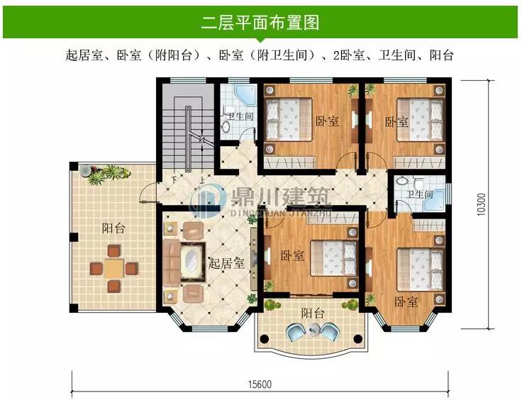 二 層:起居室、臥室(附陽臺(tái))、臥室(附衛(wèi)生間)、2臥室、衛(wèi)生間、陽臺(tái)