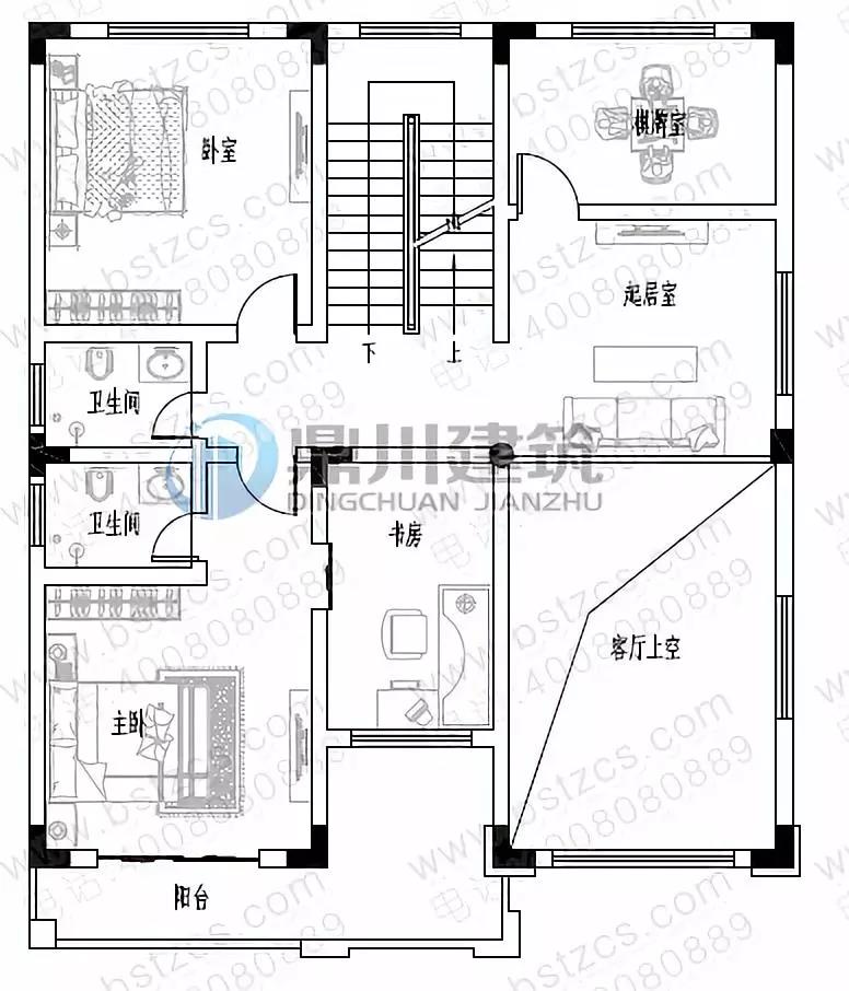 二 層:起居室、臥室(附書房,衛(wèi)生間,陽臺(tái))、臥室、棋牌室、衛(wèi)生間