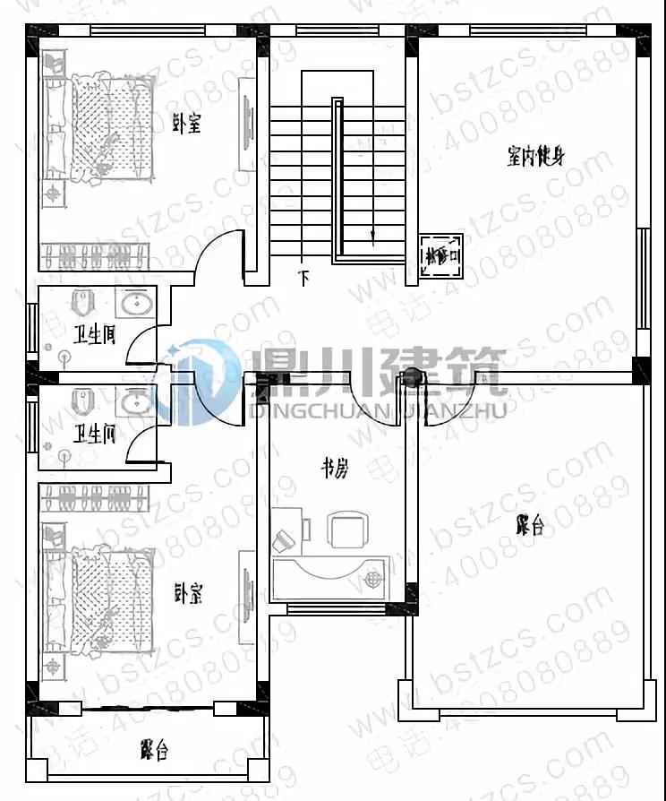 三 層:健身廳、臥室(附衛(wèi)生間,露臺(tái))、臥室、書房、衛(wèi)生間、露臺(tái)