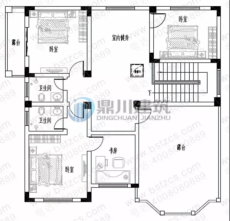 三 層:健身廳、臥室(附書房,衛生間)、臥室(附露臺)、臥室、衛生間、露臺