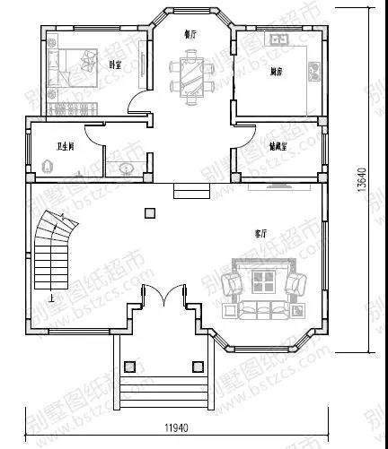 一 層:客廳、休閑廳(中空)、臥室、廚房、餐廳、儲藏室、衛生間