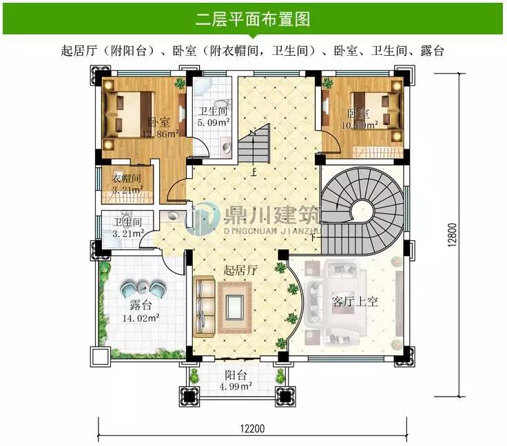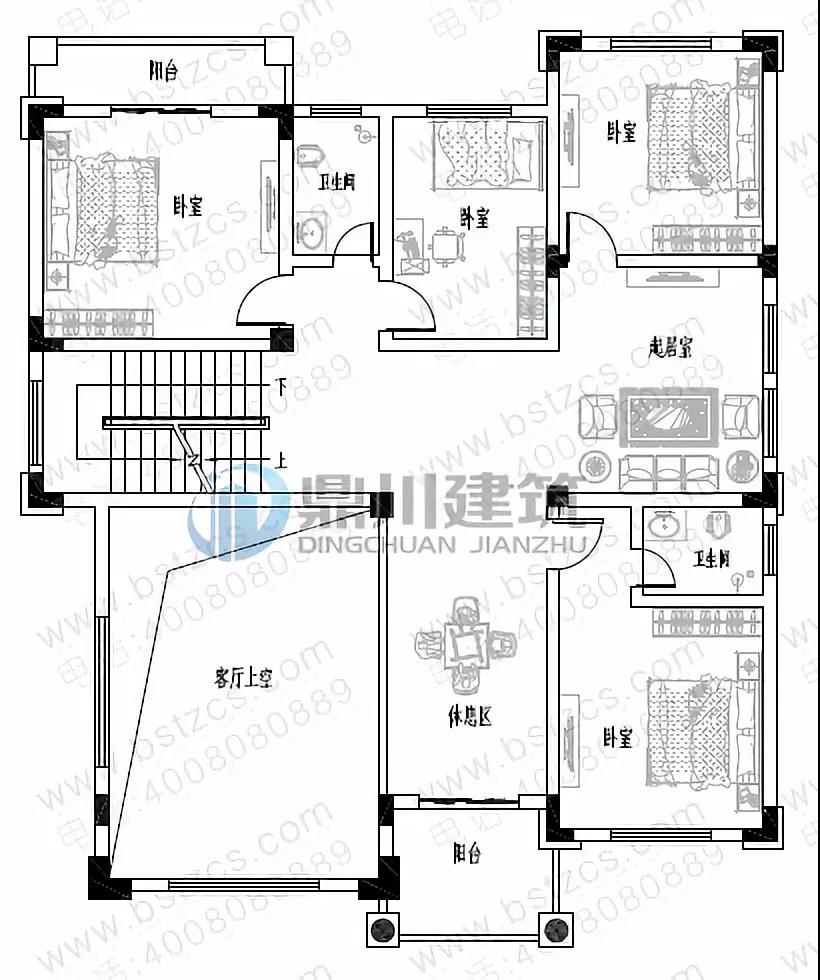 二 層:起居室、休息區(附陽臺)、臥室(附衛生間)、臥室(附陽臺)、2臥室、衛生間