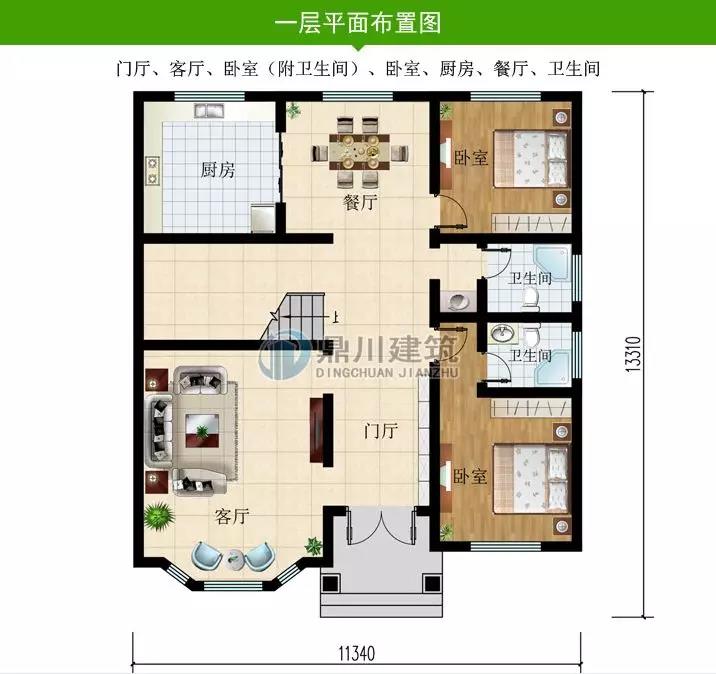 一 層: 客廳、2臥室、廚房、餐廳、衛(wèi)生間