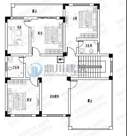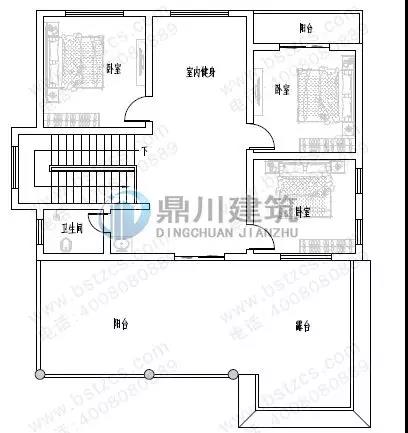 三 層: 健身廳、臥室(附陽臺)、2臥室、衛生間、陽臺、露臺
