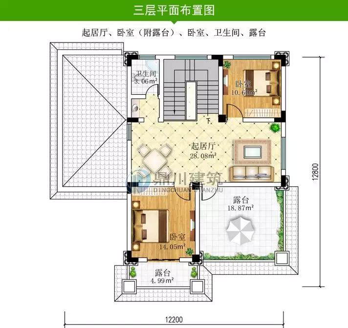 三 層: 起居廳、臥室(附露臺)、臥室、衛生間、露臺