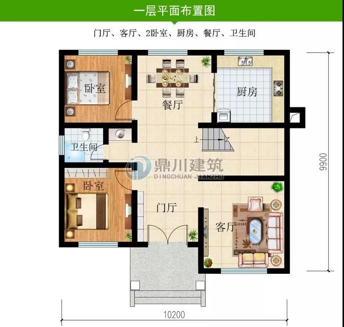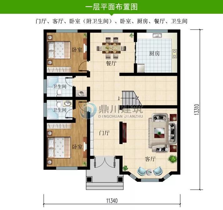 一 層: 門(mén)廳、客廳、2臥室、廚房、餐廳、衛(wèi)生間