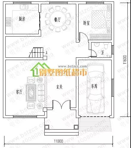 一 層: 客廳、臥室、廚房、餐廳、衛(wèi)生間、車(chē)庫(kù)