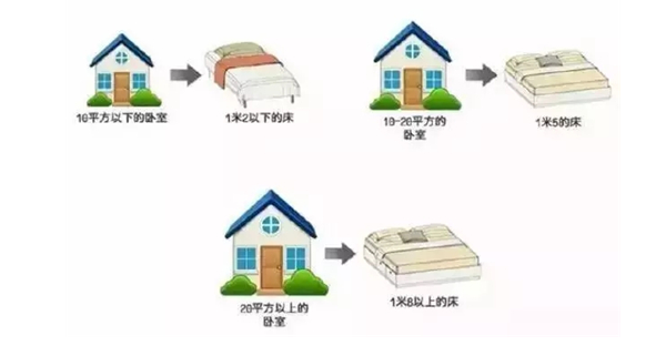 10平方米的臥室配1.2m一下的床,10平方米至20平方米配1.5m的床,20平方米以上的臥室需要配1.8m以上的床。