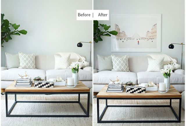 2.考慮環境——沙發旁邊的書柜、壁柜、落地燈、或是窗戶,可作為掛畫的參考。比如,參考書柜的高度和顏色,可選擇同樣顏色的畫框,掛畫高度與書柜等高,讓墻面更整體感。