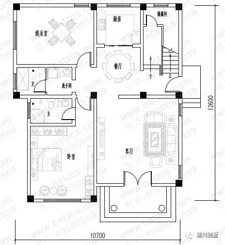 一 層:客廳、臥室(附衛(wèi)生間)、娛樂室、廚房、餐廳、儲(chǔ)藏間、衛(wèi)生間
