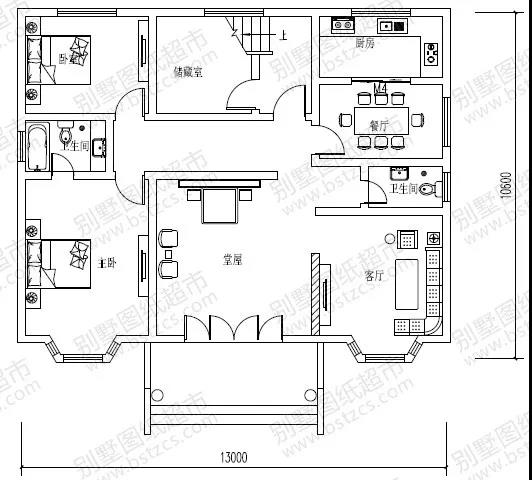 一 層: 堂屋、客廳、主臥(附衛(wèi)生間)、臥室、廚房、餐廳、儲藏室、衛(wèi)生間
