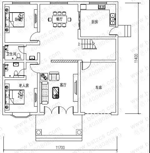 一 層: 客廳、臥室、廚房、餐廳、衛(wèi)生間、車庫或儲藏室