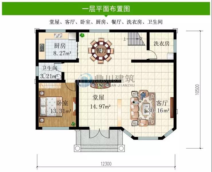 一層功能設計:堂屋、客廳、臥室、廚房、餐廳、洗衣房、衛生間。