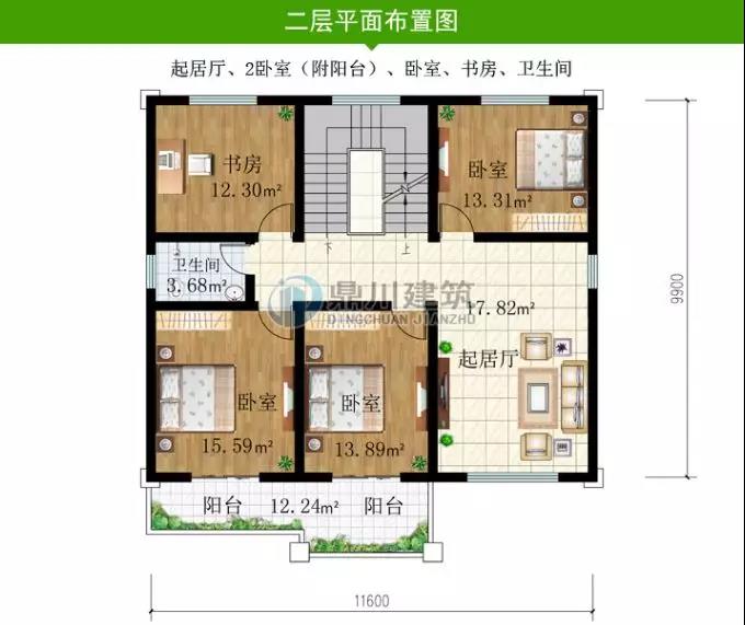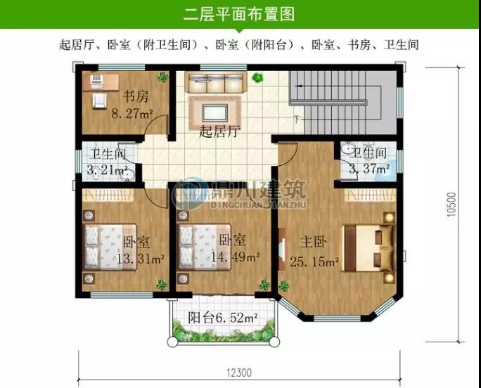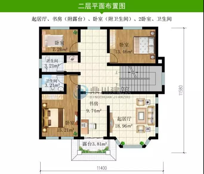 二層設有三間臥室,一個起居室,一個書房,為主要休息和工作的區域,此款戶型實用型高,很適合農村建!
