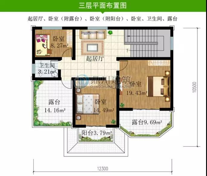 三層三露臺的設計方便觀景和休閑,整棟別墅上下含有7間臥室,農村家庭四代同堂也能住的下。