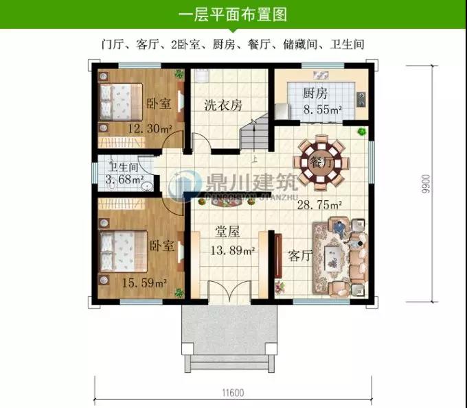 一 層: 堂屋、客廳、2臥室、廚房、餐廳、洗衣房、衛生間