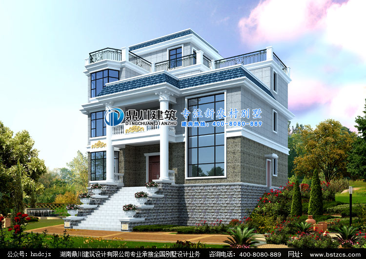 XC020四層帶露臺平屋頂別墅設計外觀效果圖,農村四層別墅私人定制設計