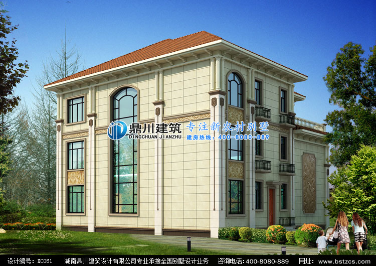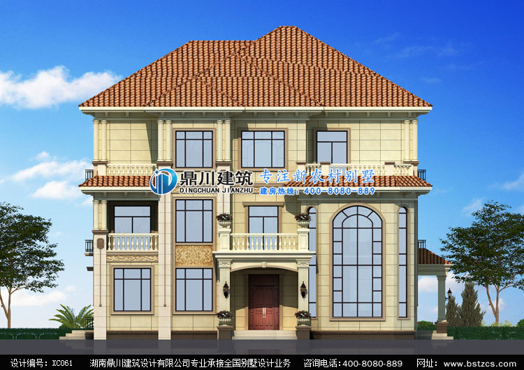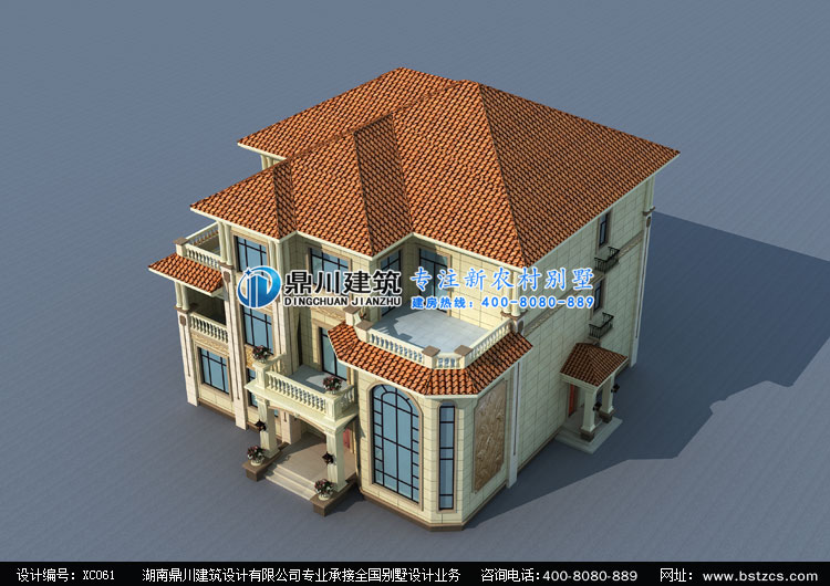 XC061歐式三層帶露臺別墅設(shè)計圖紙外觀效果圖,鼎川建筑三層別墅私人定制設(shè)計