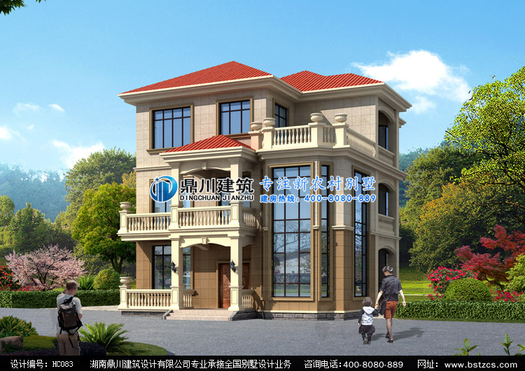 HC083復式三層農村別墅圖紙外觀效果圖,鼎川建筑三層農村住宅別墅外觀效果圖
