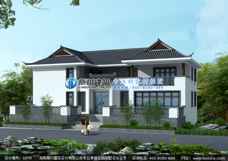 LX056二層中式三合院自建房屋設計圖紙外觀效果圖,鼎川建筑三層中式建筑設計圖