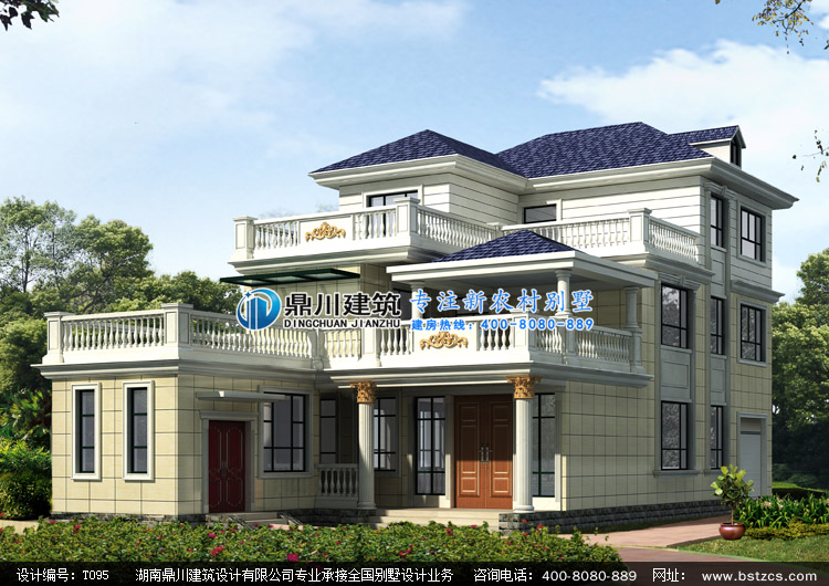 T095三層帶露臺新農村自建房設計外觀效果圖,三層鄉村別墅設計圖紙