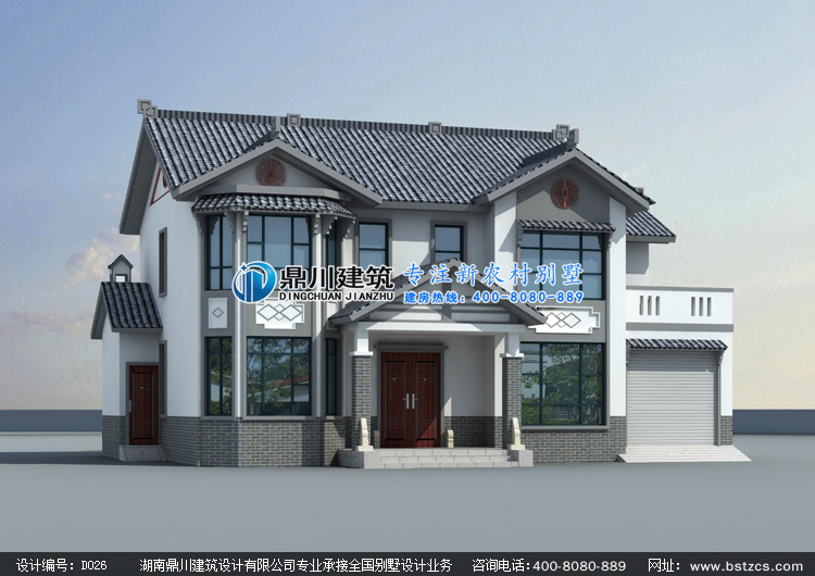 D026二層帶車庫中式別墅設計圖紙外觀效果圖,鼎川建筑中式二層別墅私人定制設計