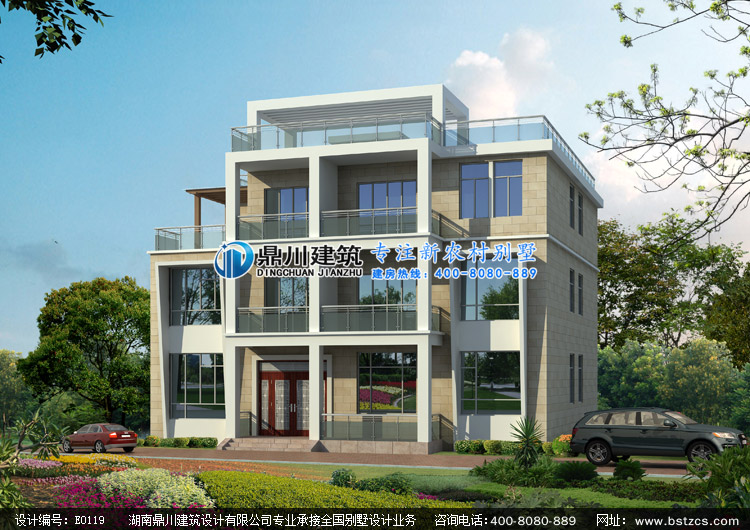 E0119現代風格三層雙拼別墅設計圖紙效果圖,三層平屋頂雙拼自建別墅設計圖