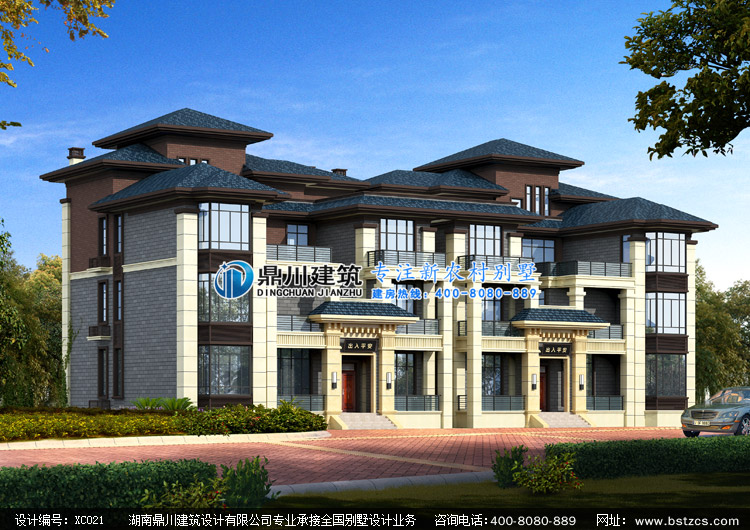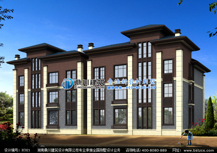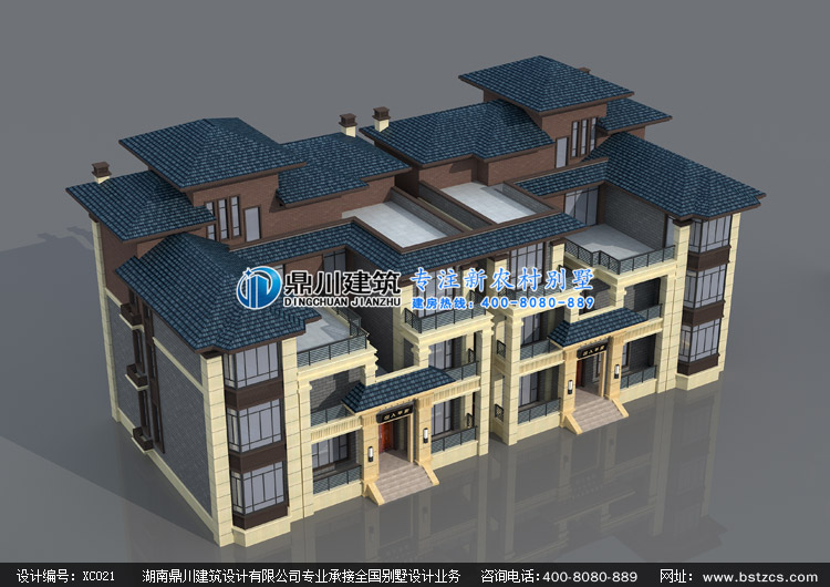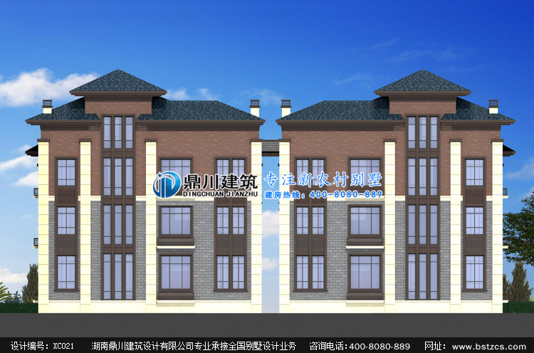 XC021三層半中式雙拼別墅設計圖紙外觀效果圖,鼎川建筑三層中式雙拼別墅設計