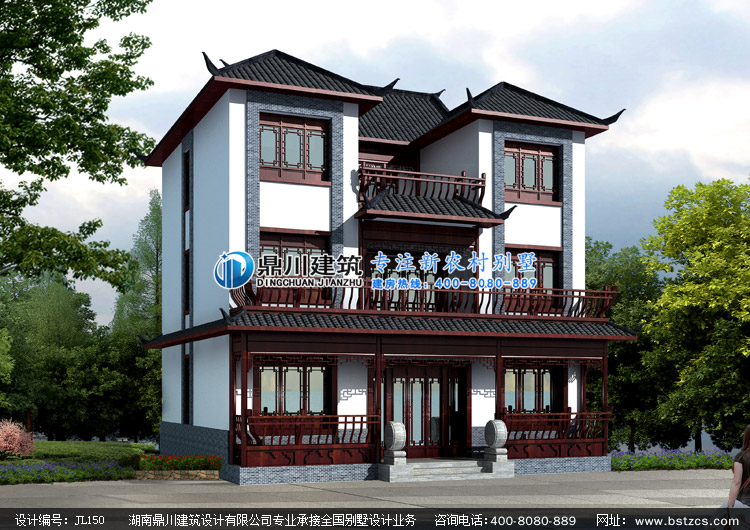JL150三層帶露臺中式別墅私人定制設計圖外觀效果圖,三層中式別墅設計圖紙