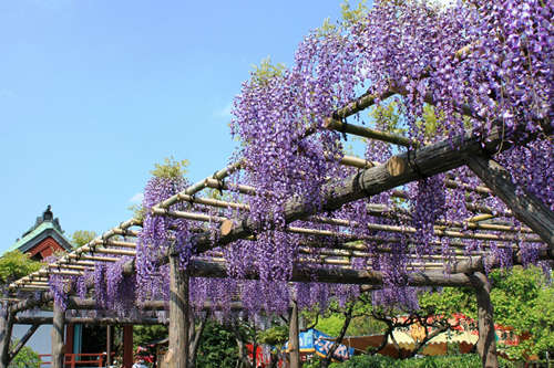日本多花紫藤是大型木質藤木,花序可達25~90厘米,一般在花園中做棚架栽植,純色花朵形成一片花的海洋,整體效果十分壯觀,仲夏又為消暑的綠茵,秋季莢果迎風搖曳,而到了隆冬紫藤的枝干又傳達著濃濃生機。多花紫藤為長壽樹種,適宜家庭庭院種植。
