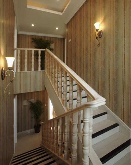 象牙白著稱的英式田園風(fēng)格的樓梯有一些簡(jiǎn)單的雕刻,渾厚的質(zhì)感像一件石膏藝術(shù)品,配上活潑的條紋壁紙,跳躍中又不乏寧?kù)o的感覺(jué),十足的鄉(xiāng)村氣息彌漫在樓梯間,溫馨的壁燈簡(jiǎn)單俏皮,顯得很溫馨,特別的設(shè)計(jì)是黑白相接的階梯,像美妙的鋼琴鍵盤,奏出美妙的和旋。