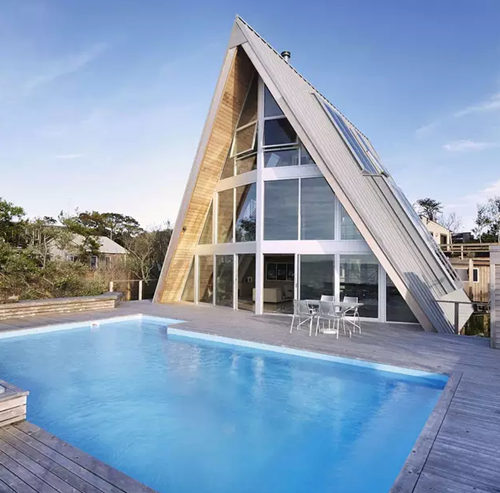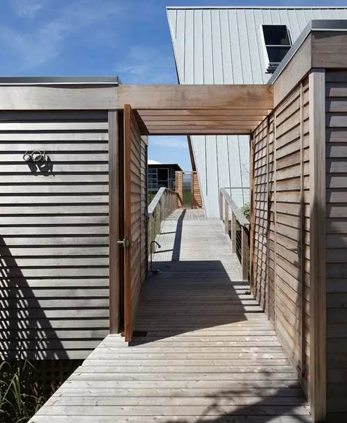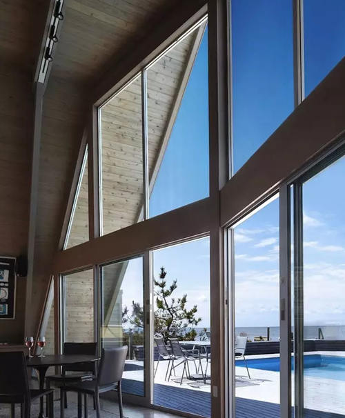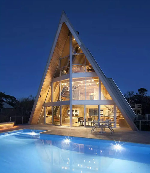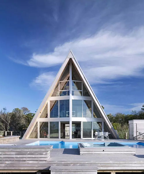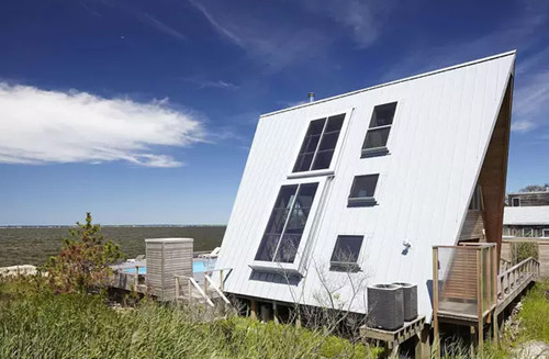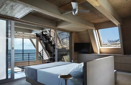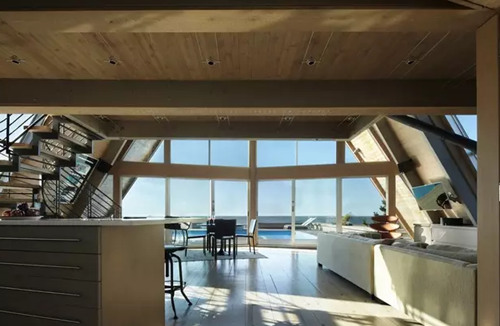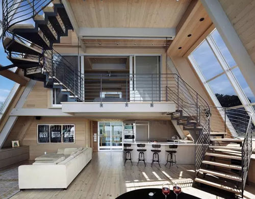 這棟別墅是在一個舊的三角型斜頂型老房子的基礎(chǔ)上改造完成,經(jīng)過精心的設(shè)計和施工,賦予了現(xiàn)代建筑元素和功能,房子外表用金屬鋁板包裹,朝海的一面做了大面積的玻璃幕墻,很難再讓人看出這是棟舊建筑。 房子內(nèi)部的布局也非常有特點(diǎn),房子共有三層,由一部旋轉(zhuǎn)樓梯連接,越向上面積越小,客廳做成了中空,欣賞海景時可以看到更多藍(lán)天,同時每個房間都開了斜窗,保證了陽光的充足。
