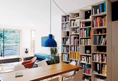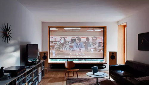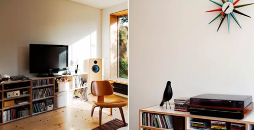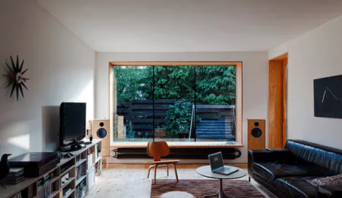 將客廳的窗口挖深,變成小型的飄窗座位;同時這個窗口上方還藏了個投影機的螢幕,隨時變身家庭電影院,很贊吧。