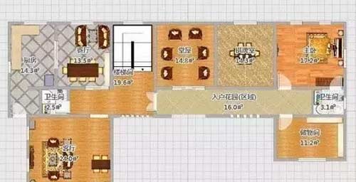 首層建筑面積為176平方米,有堂屋、客廳、餐廳、廚房、棋牌室、老人房和儲(chǔ)藏室。