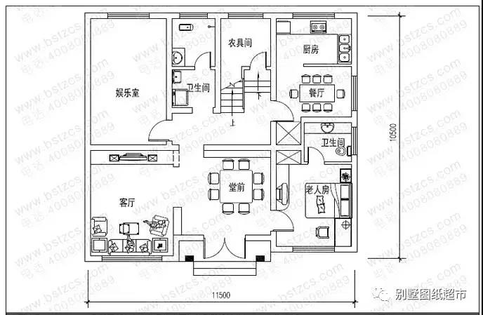 一 層:堂屋、客廳、老人房(附衛生間)、娛樂室、廚房、餐廳、農具間、衛生間