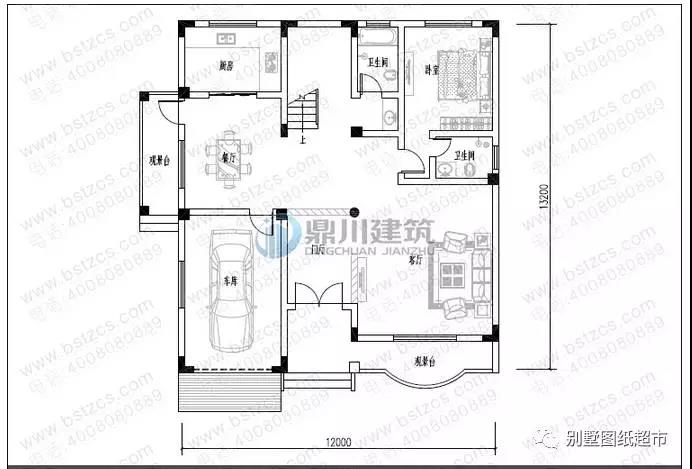 一 層:門廳、客廳、臥室(附衛生間)、廚房、餐廳、觀景臺、衛生間、車庫