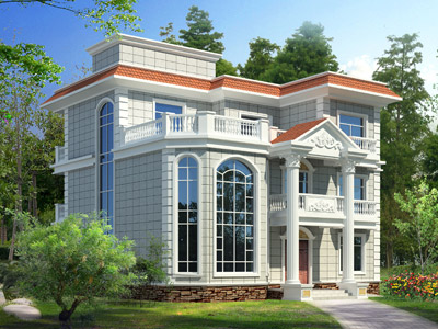 J0184三層帶露臺平屋頂歐式別墅外觀效果圖,鼎川建筑三層別