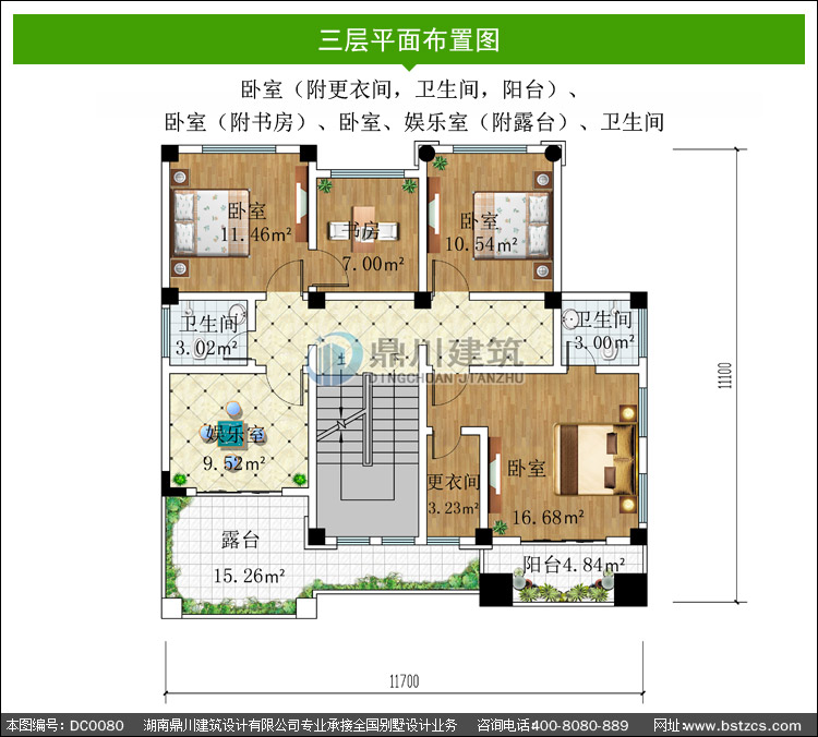 三 層: 臥室(附更衣間,衛生間,陽臺)、臥室(附書房)、臥室、娛樂室(附露臺)、衛生間