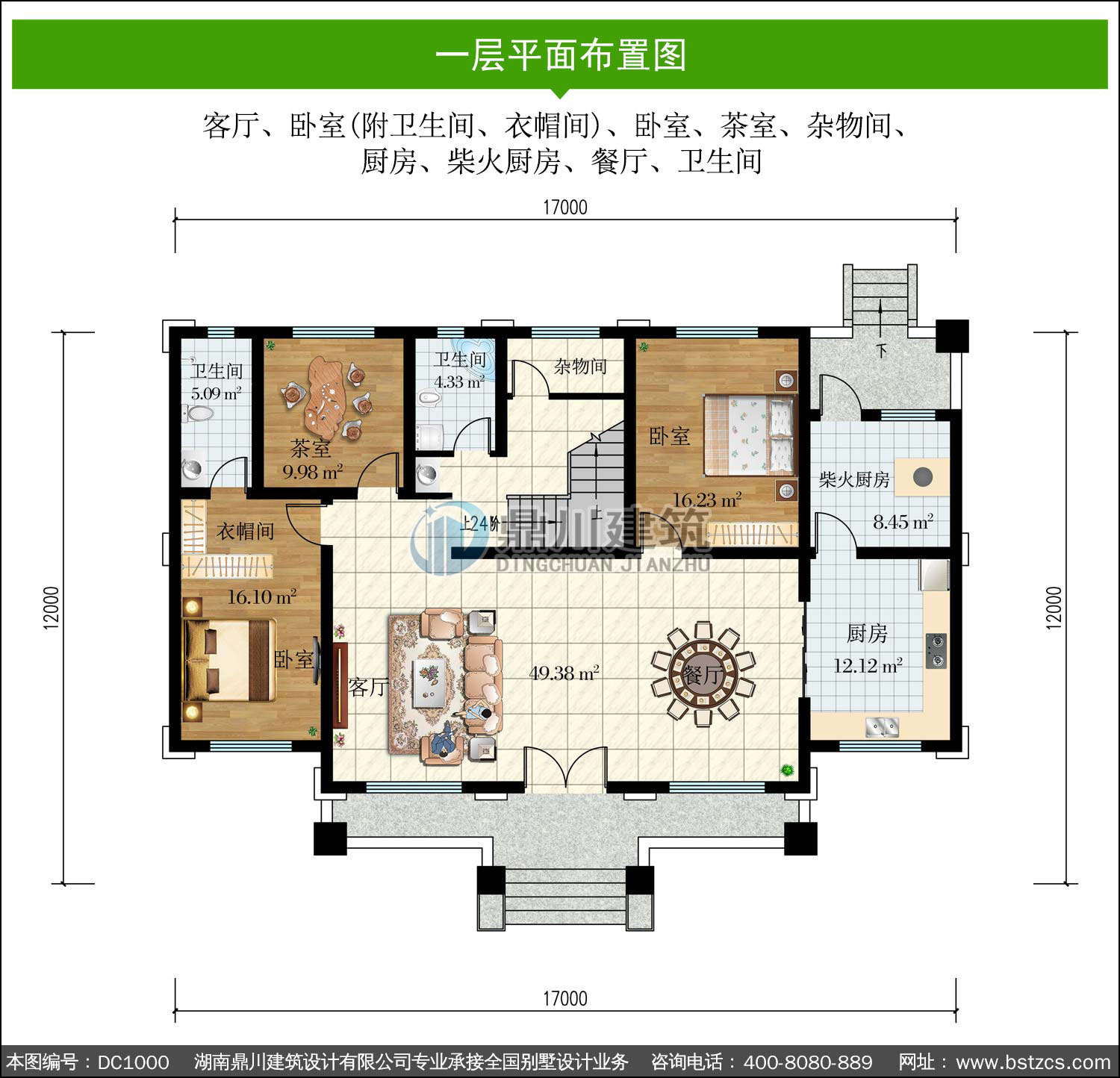| 一 層: | 客廳、臥室(附衛(wèi)生間、衣帽間)、臥室、茶室、雜物間、廚房、柴火廚房、餐廳、衛(wèi)生間 | |||