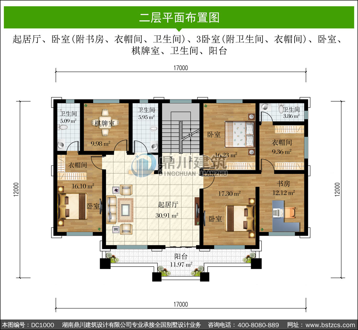 | 二 層: | 起居廳、臥室(附書房、衣帽間、衛(wèi)生間)、3臥室(附衛(wèi)生間、衣帽間)、臥室、棋牌室、衛(wèi)生間、陽臺(tái) | |||