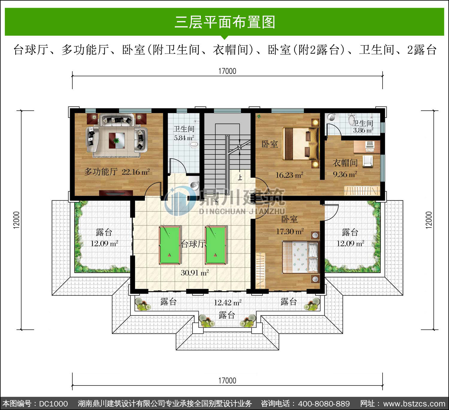 | 三 層: | 臺(tái)球廳、多功能廳、臥室(附衛(wèi)生間、衣帽間)、臥室(附2露臺(tái))、衛(wèi)生間、2露臺(tái) | |||