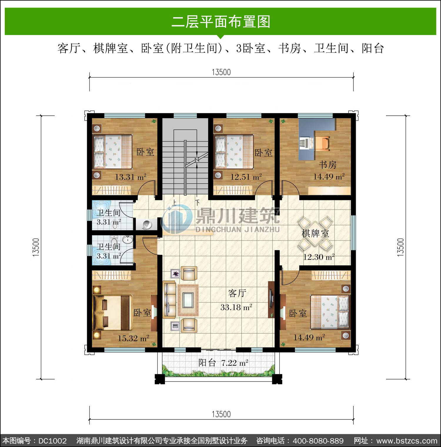| 二 層: | 客廳、棋牌室、臥室(附衛生間)、3臥室、書房、衛生間、陽臺 | |||