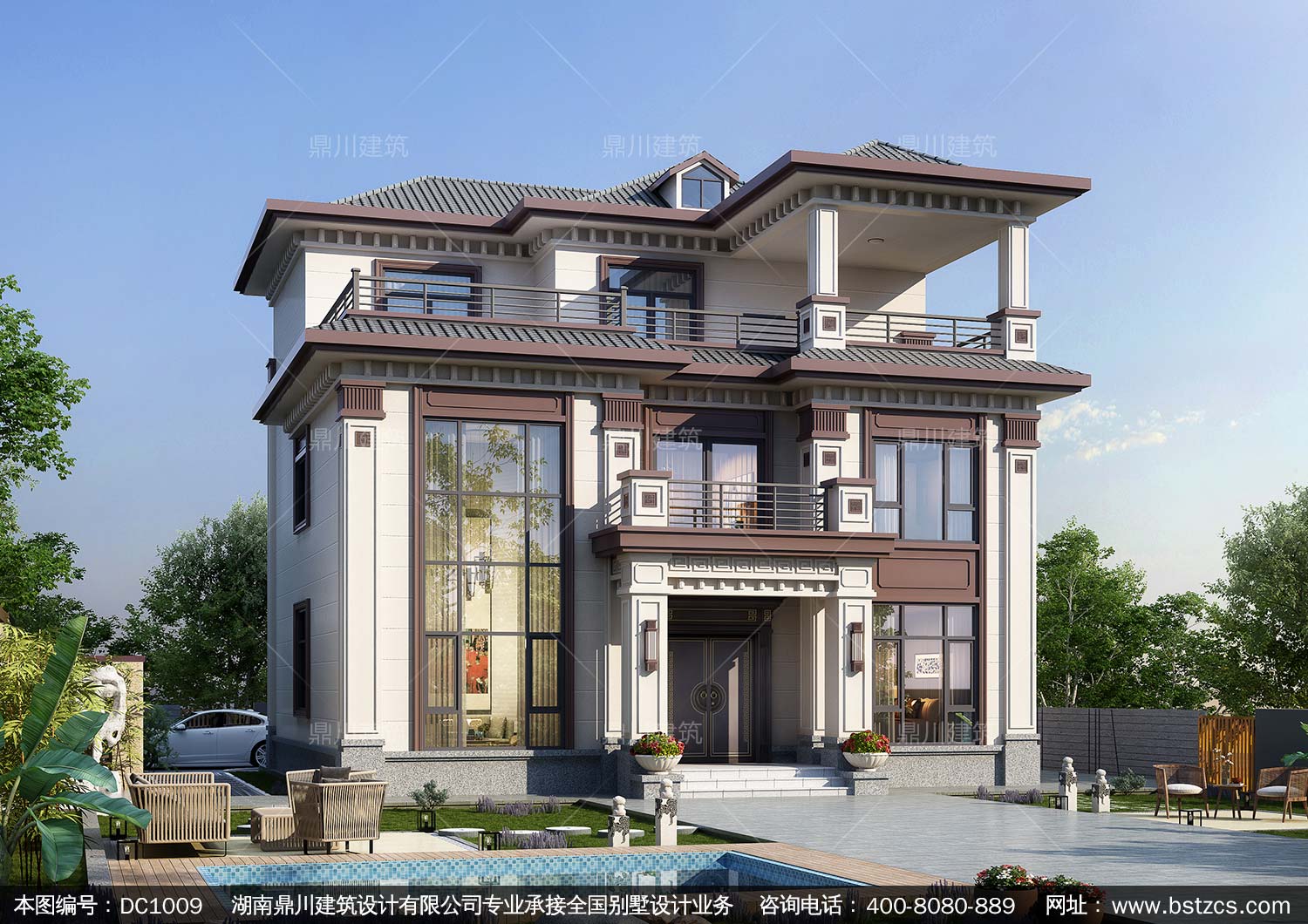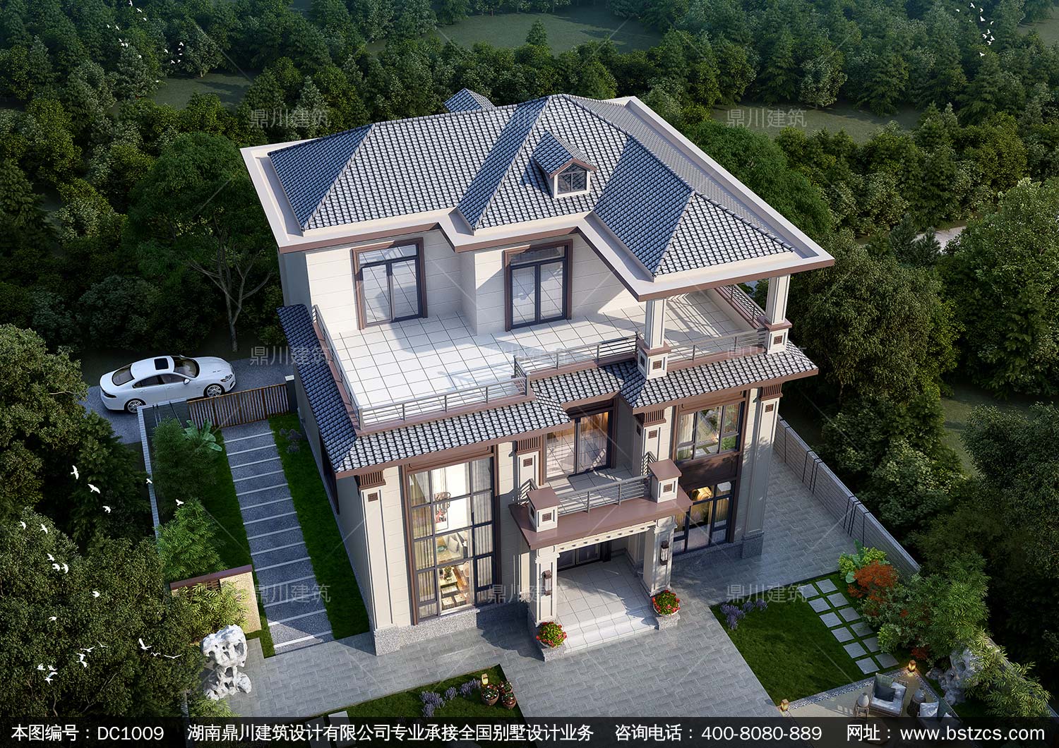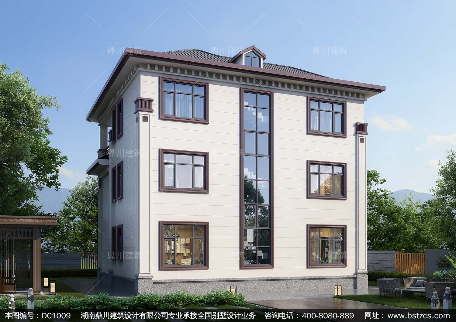 三層新中式帶露臺別墅圖紙及外觀效果圖_農村自建房設計,鼎川建