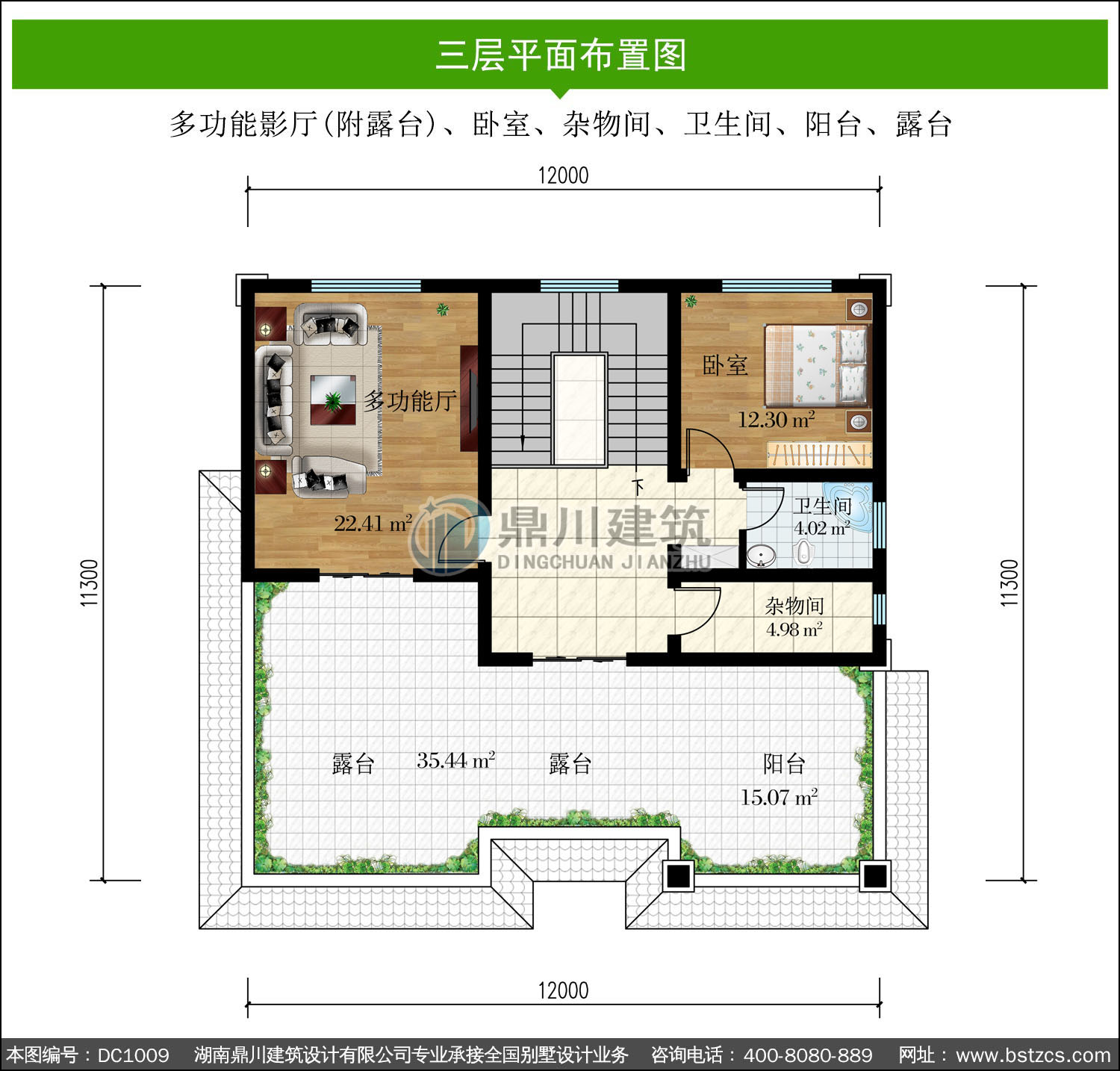 | 三 層: | 多功能影廳(附露臺)、臥室、雜物間、衛生間、陽臺、露臺 | |||