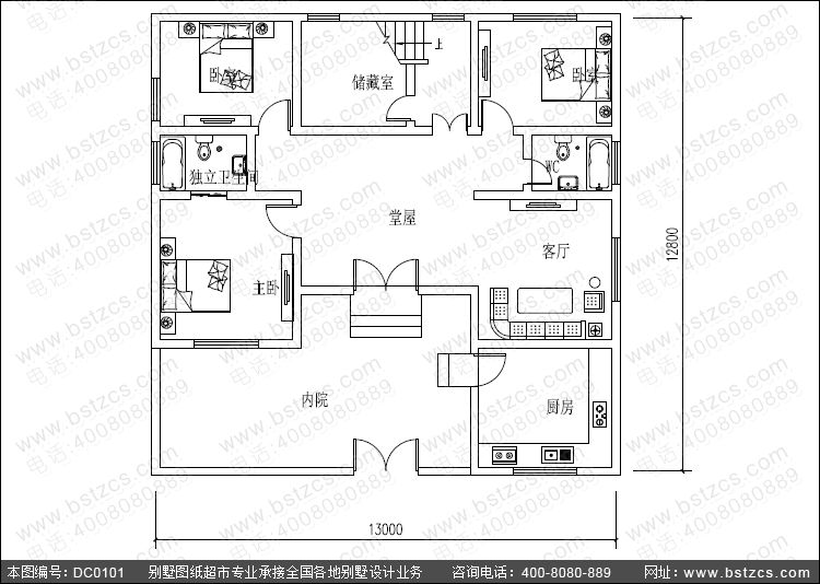 | 一 層: | 內院、堂屋、客廳、臥室(附衛生間)、2臥室、廚房、儲藏室、衛生間 | |||