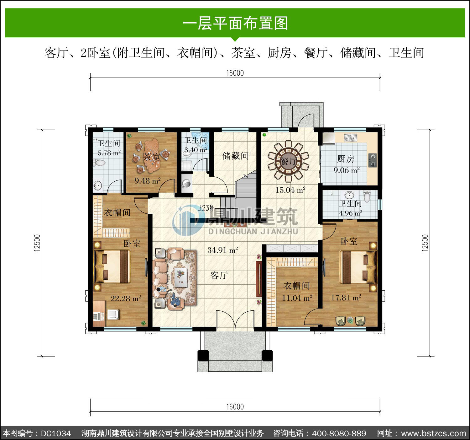 | 一 層: | 客廳、2臥室(附衛生間、衣帽間)、茶室、廚房、餐廳、儲藏間、衛生間 | |||