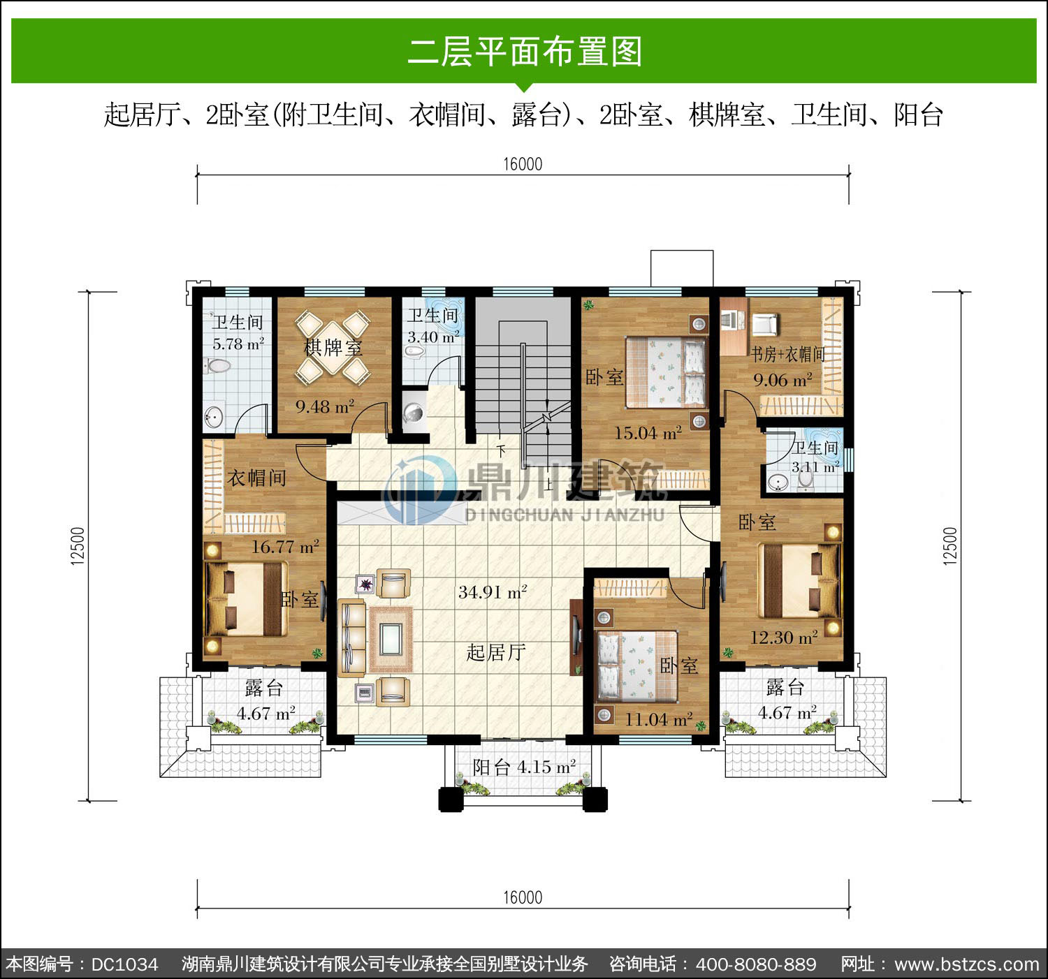 | 二 層: | 起居廳、2臥室(附衛生間、衣帽間、露臺)、2臥室、棋牌室、衛生間、陽臺 | |||