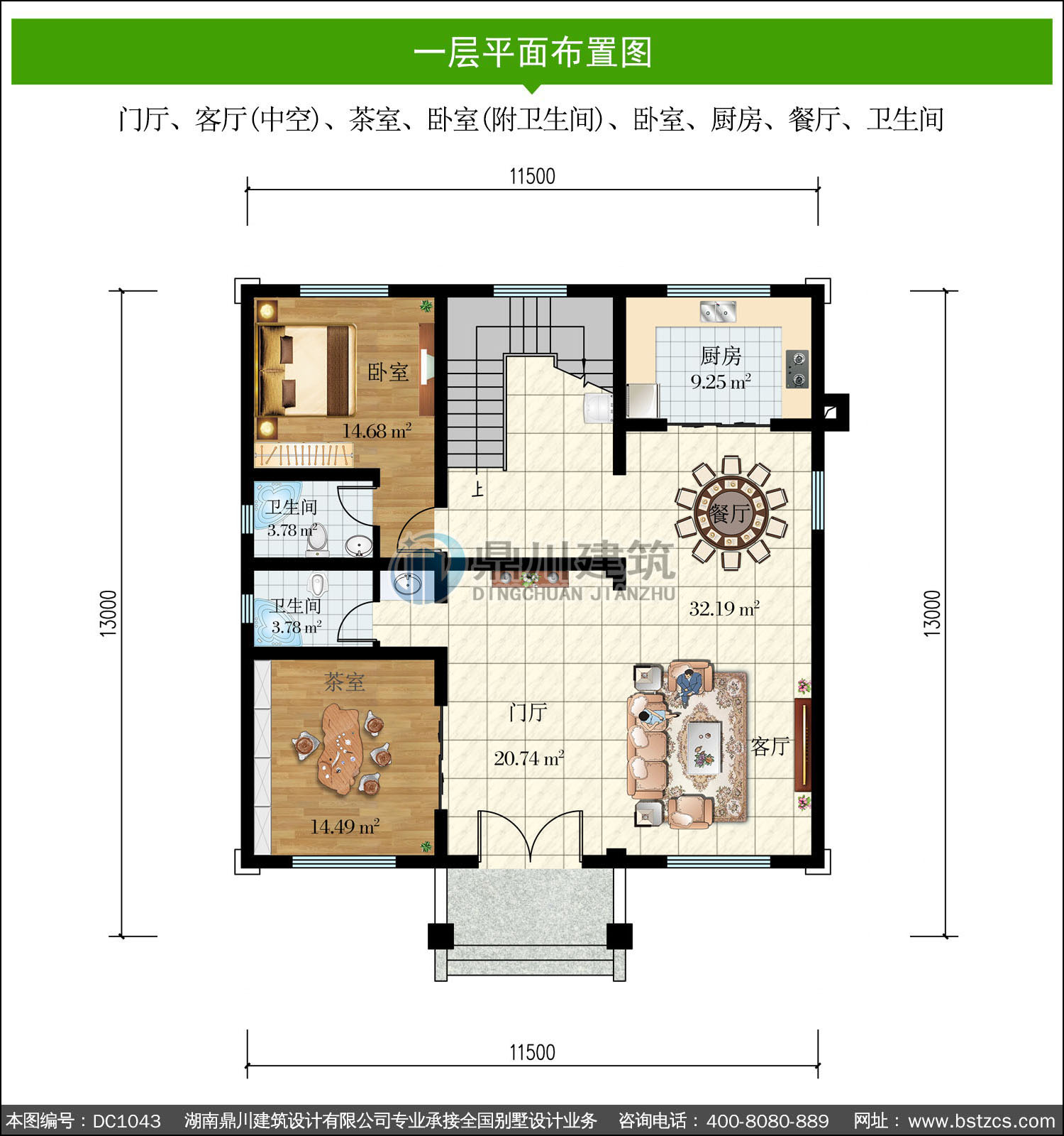 | 一 層: | 門廳、客廳(中空)、茶室、臥室(附衛生間)、臥室、廚房、餐廳、衛生間 | |||